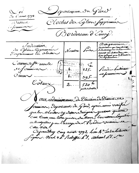 Bernard Pagés a retrouvé la copie du bordereau de transport de ces cloches, le 5 août 1792, par un dénommé Redieu de Sommières.