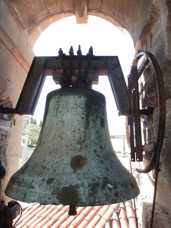 Pour voir où a été installée cette cloche, il faut faire l’ascension du clocher. C’est à partir du passage voûté situé dans la sacristie de l’église, que Marcel Rivière a pu accéder jusqu’à sa partie supérieure, pour la photographier. Et là, stupéfaction, on n’est pas en présence d’une unique cloche comme on pouvait s’y attendre, mais de trois ! Elles sont placées sous trois des quatre baies libres cintrées du clocher. A l’ouest, face à la ville et à la colline de Montredon, on trouve une cloche portant l’inscription suivante (en relief) :
