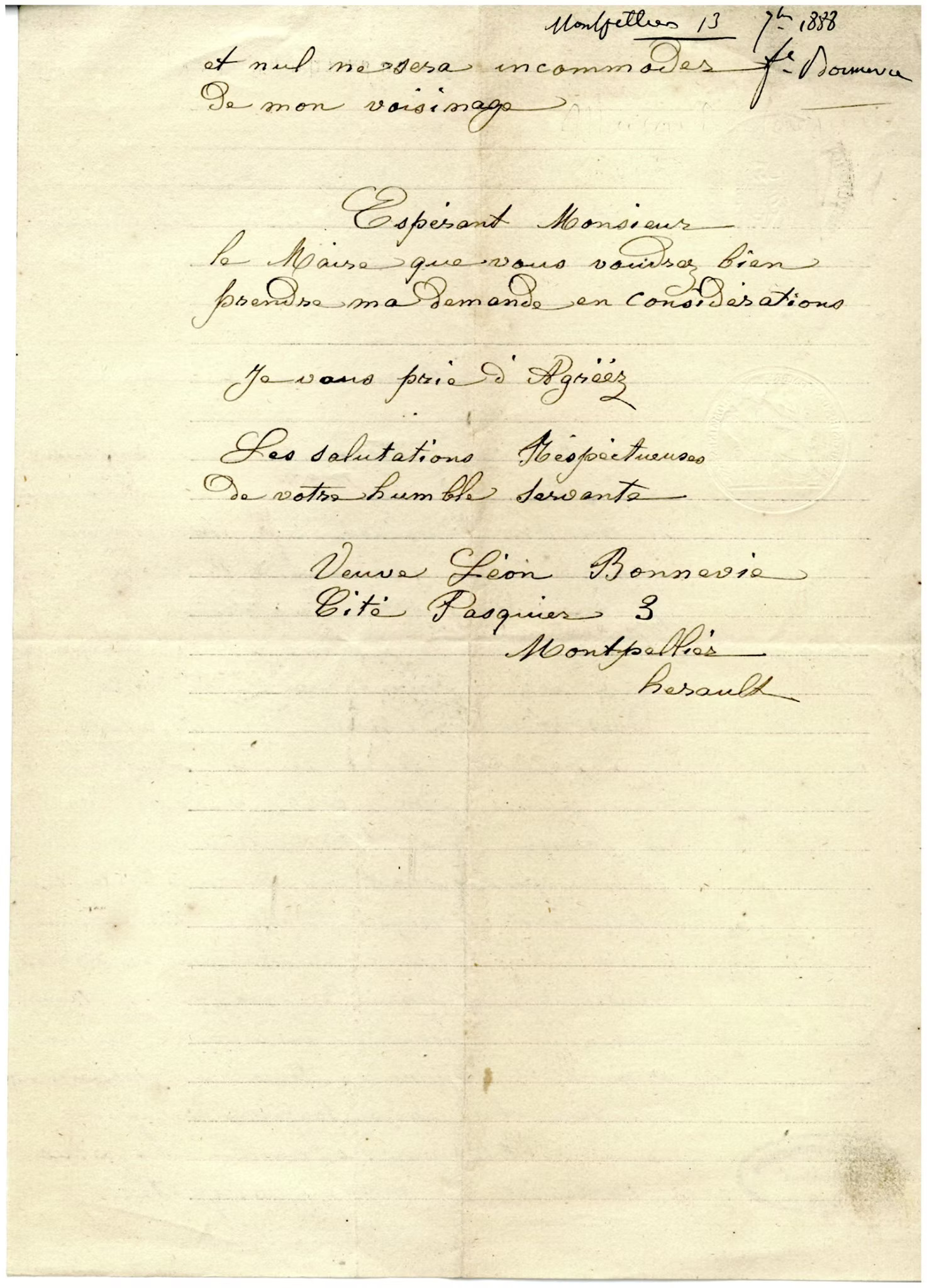 Il n’y a plus de traces, de nos jours, de cette activité. Toutefois, nous avons trouvé, dans les archives communales, deux lettres de tenancières d’un tel établissement. Elles souhaitent venir exercer leur activité dans notre ville. Voici un extrait d’une de ces lettres, écrite par Mme Bonnevie. Elle date de septembre 1888.